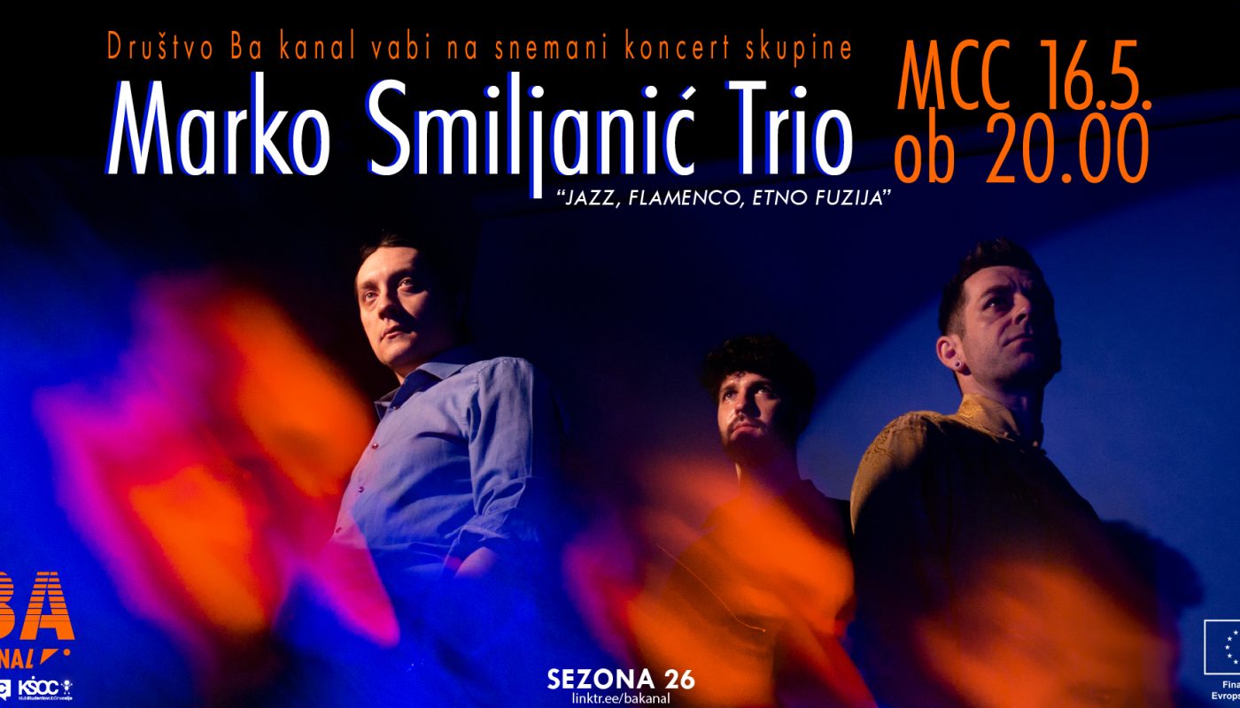 Društvo Ba kanal nadaljuje sezono s koncertom zasedbe Marko Smiljanić Trio. Vabljeni na večer plesno-klasičnih melodij s prav posebno priložnostjo, da ste pomemben del koncerta, ki ga bo društvo tudi zvočno in video ovekovečilo ter pripravilo v reportažne posnetke, ki bodo postali del naše knjižnice slovenske avtorske glasbe!***